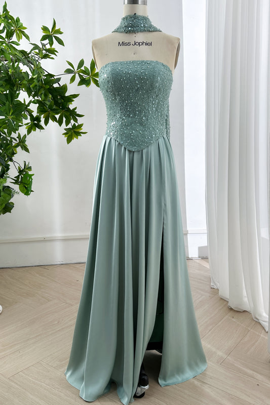 Turquoise Sequin Corset A-Line Evening Dress with Convertible Scarf