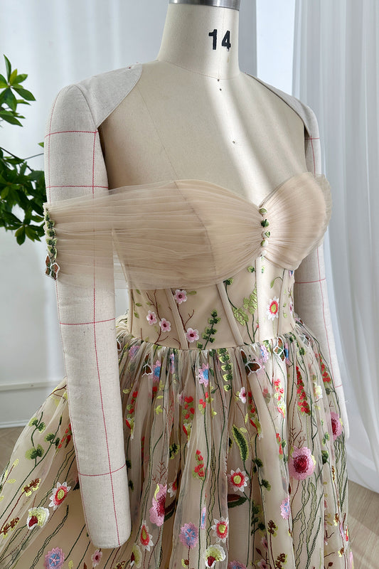 Vintage Inspired Wildflower Floral Embroidery Off-The-Shoulder Evening Dress