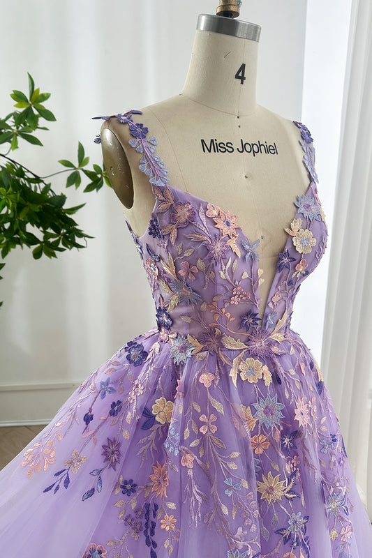 Pastel Floral Embroidery A-Line Tulle Wedding Dress with Deep V Neck