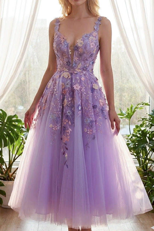 Enchanted Lavender Garden Embroidery Tulle Midi Dress