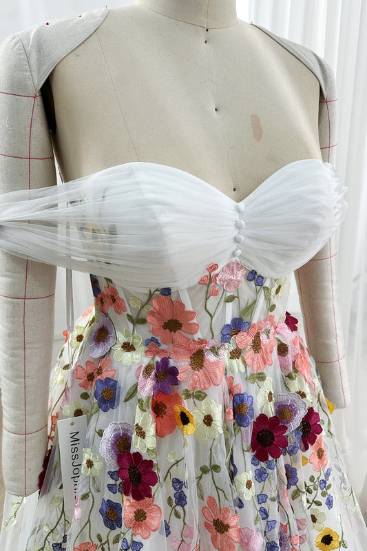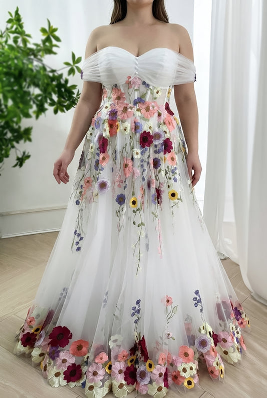 Off the Shoulder Floral Embroidered Tulle Ball Gown with Corset Back