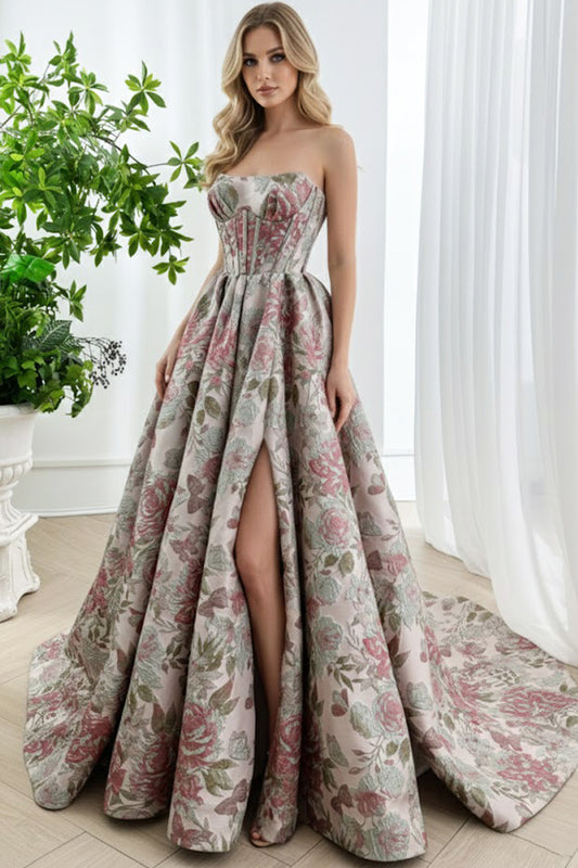 Romantic Vintage Pink Blush Rose Floral Ball Gown with Corset Bodice