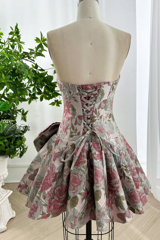 Vintage-Inspired Floral Jacquard Short Dress with Oversized Bow