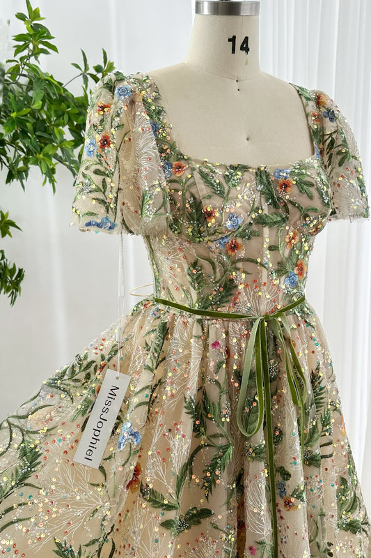 Floral Embroidered Sequin Tulle Midi Dress with Puff Sleeves