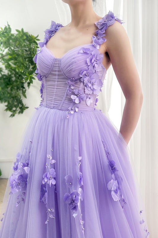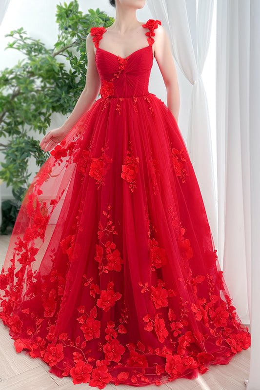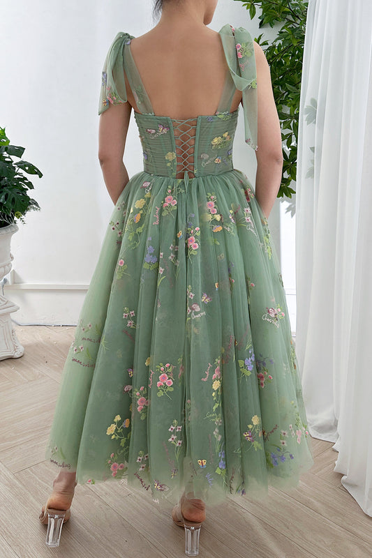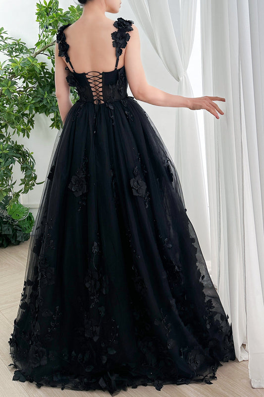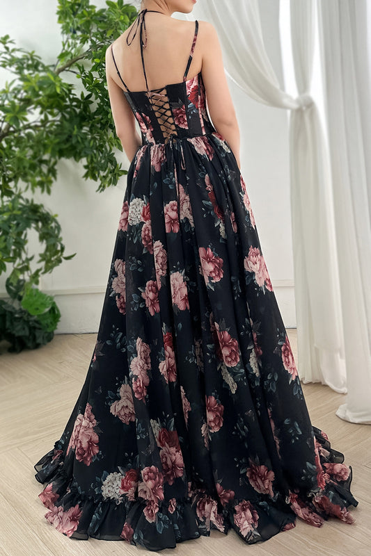 Corset Straps V Neck 3D Floral Dress with Lace Up Back