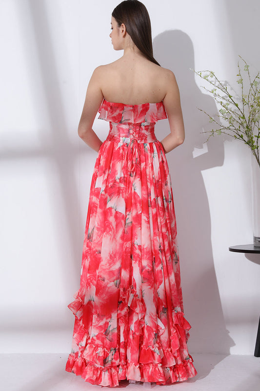 Corset Strapless Floral Print Chiffon Dress with Slit