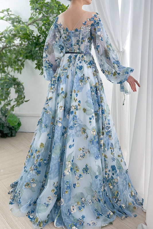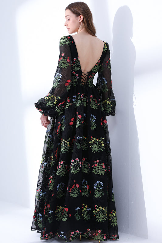 Corset Illusion Boat Neck Floral Embroidery Dress with Sleeves