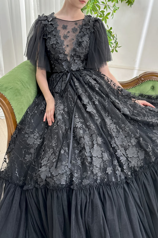 Illusion V Neck 3D Floral Black Dress with Short Sleeves