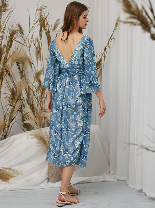 Long Sleeves V Neck Chiffon Print Floral Teal Formal Party Dress with Slit