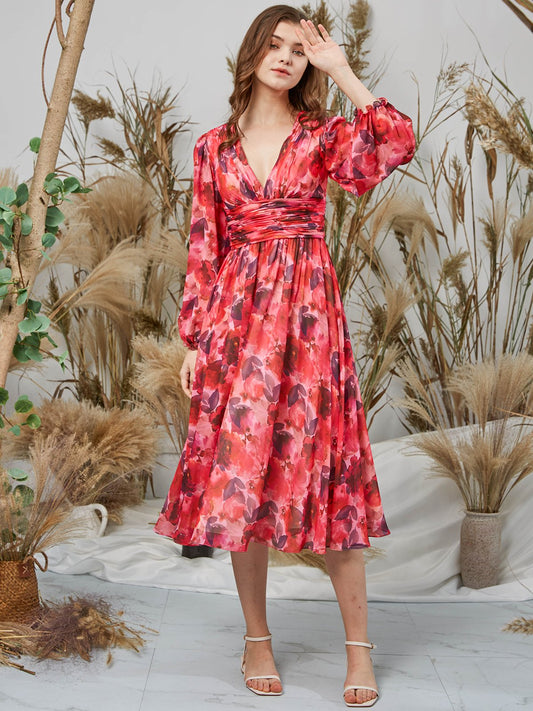 Long Puff Sleeves V Neck Chiffon Print Floral Red Formal Dress