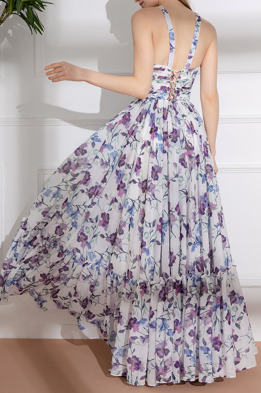 Träger V-Ausschnitt Korsett Stufenblümchen Chiffon Langes Kleid