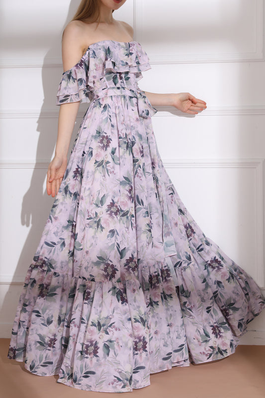 Schulterfreies Korsett-Stufenkleid aus Chiffon mit Blumendruck