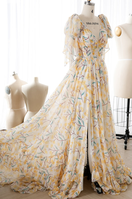 Infinity Corset – Langes Chiffon-Kleid mit Blumendruck und Schlitz