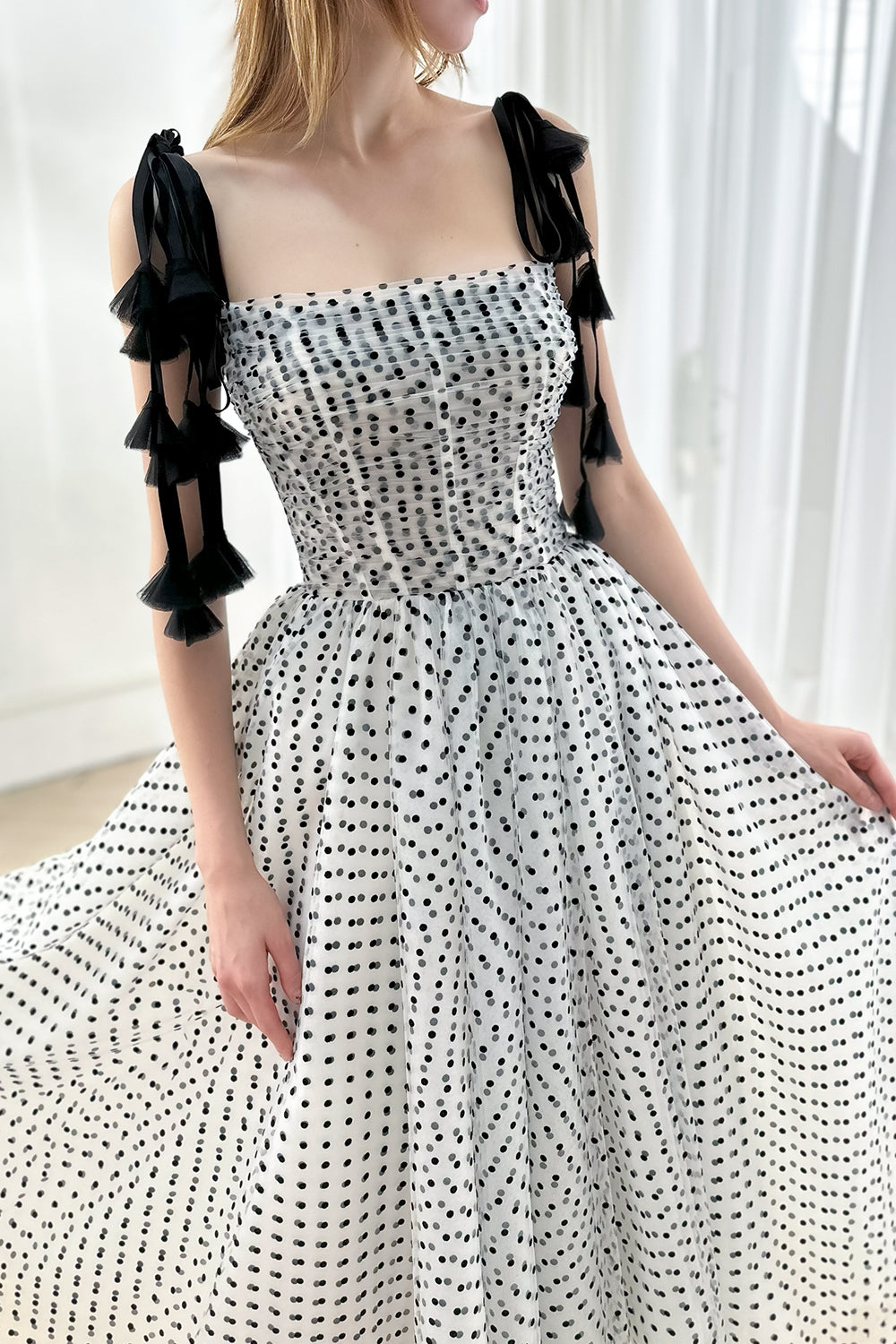 Schwarzes Midikleid mit Korsett-Trägern und Polka Dots