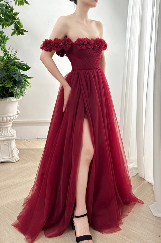 Schulterfreies, mit Blumen verziertes Korsett-Langes Kleid mit Seitenschlitz