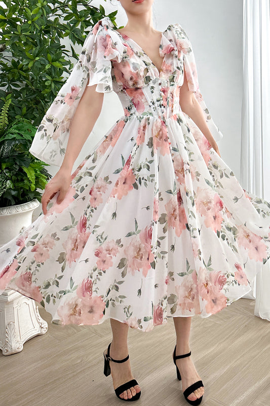 Langärmliges Korsett-Chiffonkleid mit V-Ausschnitt und Blumendruck und Seitenschlitz
