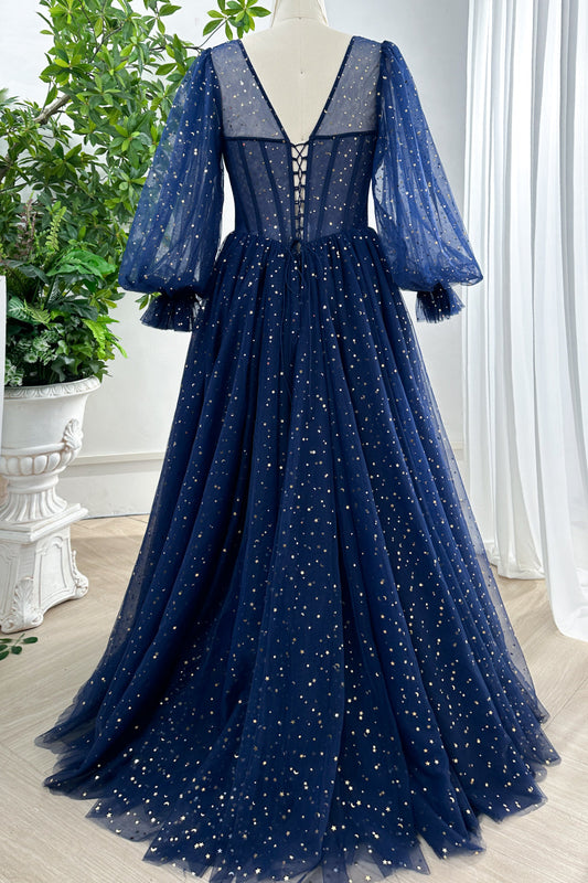 Korsett V-Ausschnitt Lange Puffärmel Tüll Stern Marineblaues Kleid