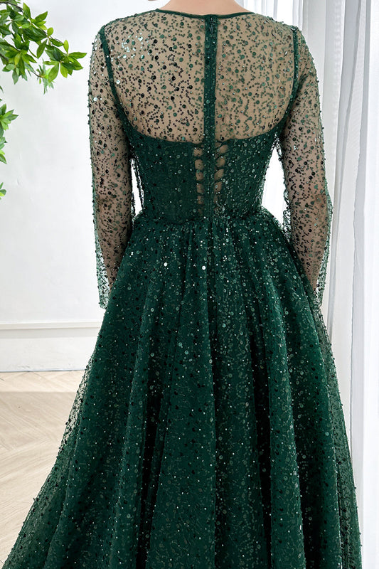 Korsett Langarm O-Ausschnitt Pailletten Dunkelgrün Kleid