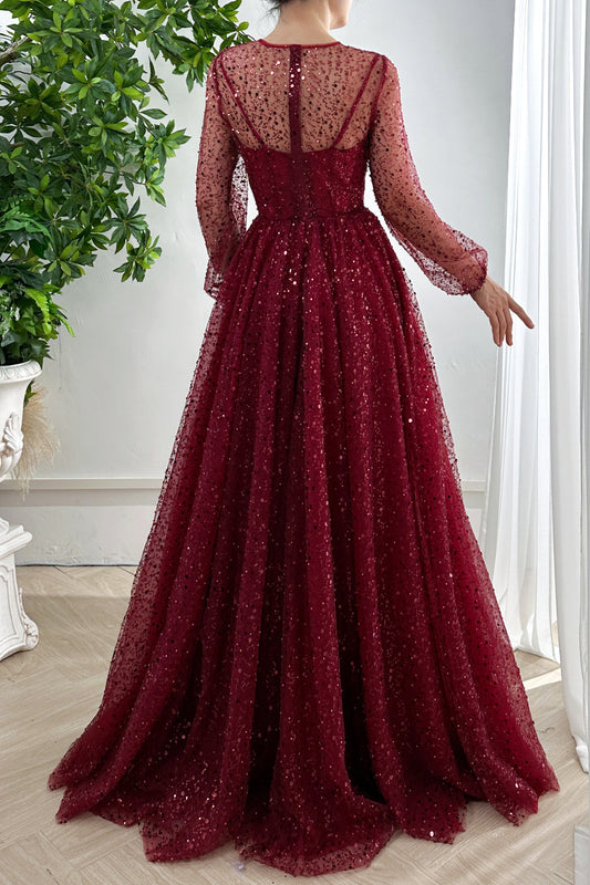 Korsett Langarm O-Ausschnitt Pailletten Burgunder Kleid mit Schlitz