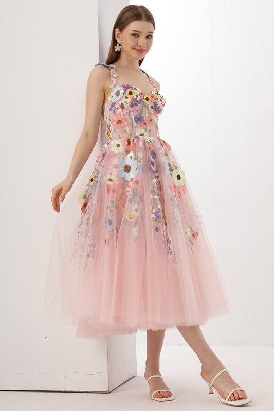 Midikleid mit Korsett-Blumenapplikation und Bindeträgern