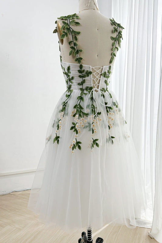 Ärmelloses Midi-Brautkleid mit V-Ausschnitt und 3D-Blumenapplikation
