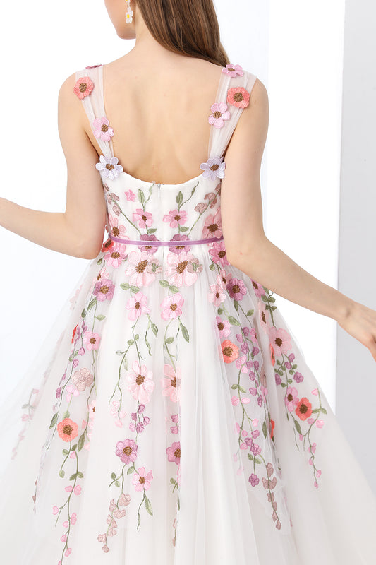 Korsett-Midikleid mit farbenfroher Blumenstickerei und abnehmbaren Trägern
