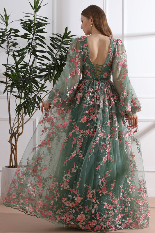 Langärmliges Rundhalskleid aus rosa Tüll mit Blumenstickerei und Salbeigrün