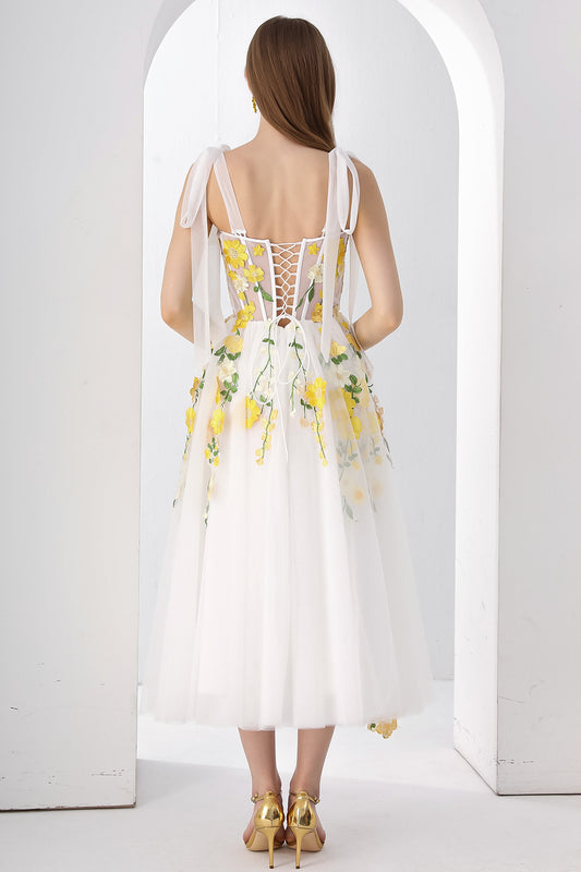 Trägerloses Korsettkleid mit Blumenapplikationen und Bindebändern