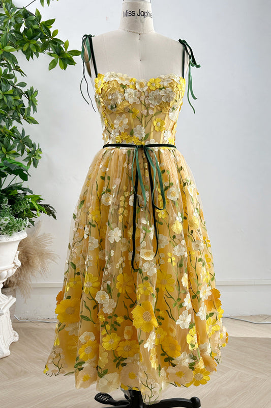 Trägerloses Korsett-Midikleid in Gelb mit Blumenstickerei