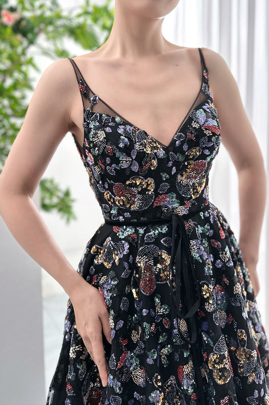 Träger V-Ausschnitt Perlen Pailletten Blumen Schwarzes Kleid