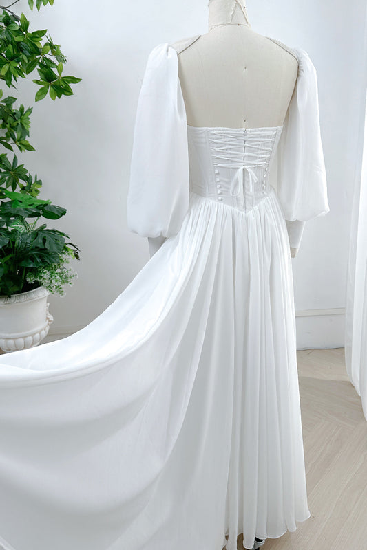 Vestido de novia largo de gasa color marfil con corsé y mangas abullonadas extraíbles