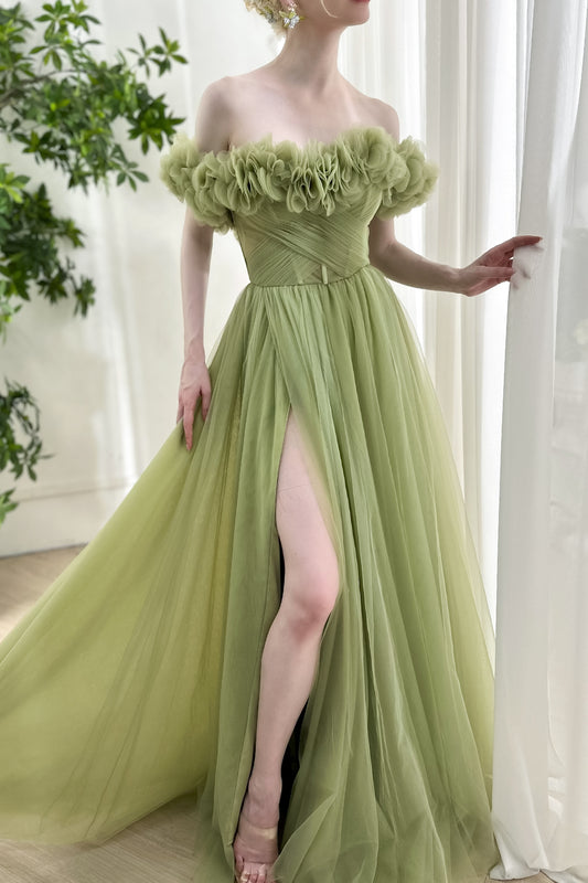Vestido formal con hombros descubiertos y flores hechas a mano con abertura