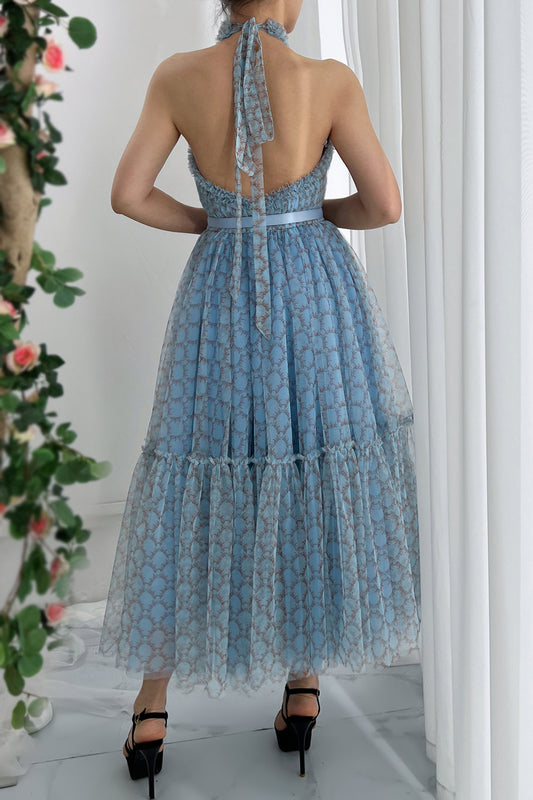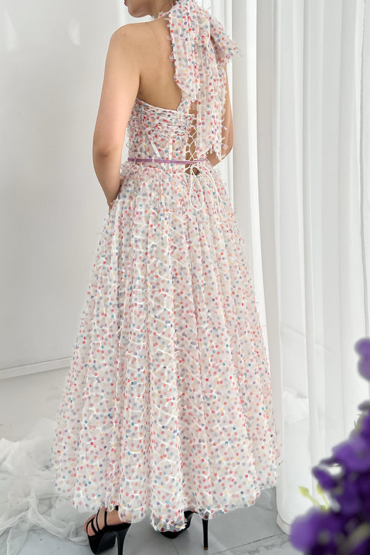 Vestido de fiesta de tul con estampado floral, espalda con lazo y mangas abullonadas extraíbles