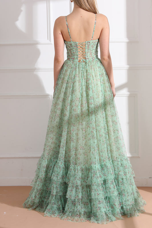 Vestido de fiesta de tul con capas y estampado floral con corsé recortado