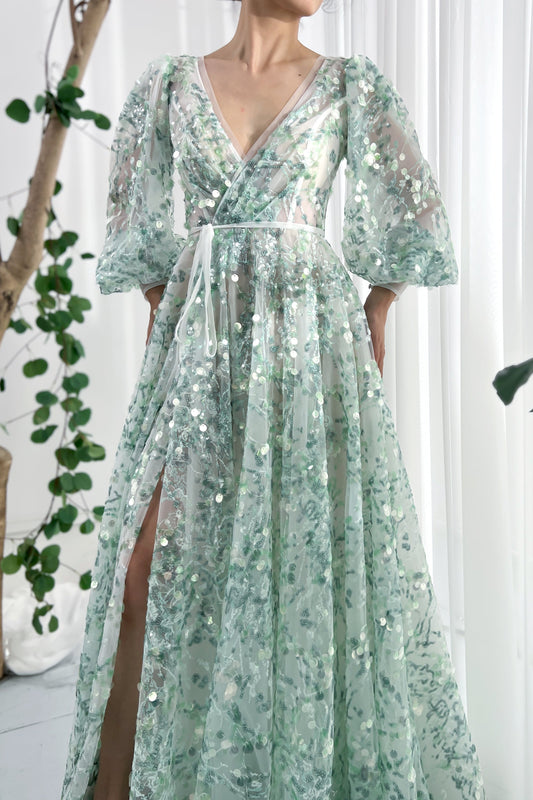 Vestido de lentejuelas color aguamarina con escote en V y mangas abullonadas con abertura lateral