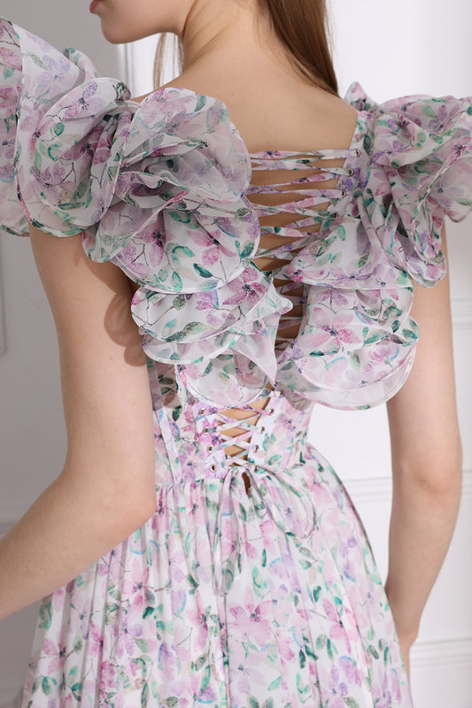 Vestido de gasa con volantes, corsé, estampado floral y capas