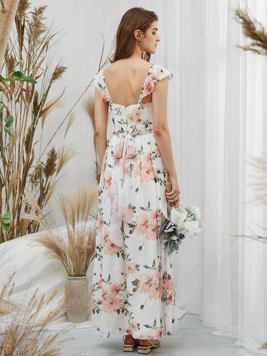 Vestido de fiesta envolvente con escote en V de gasa floral y mangas cortas para damas de honor