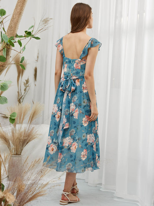 Vestido de fiesta midi en gasa floral verde azulado con tirantes y escote en V