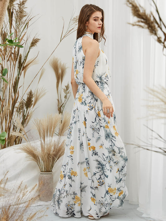 Vestido de cóctel largo en gasa floral con cuello barco sin mangas