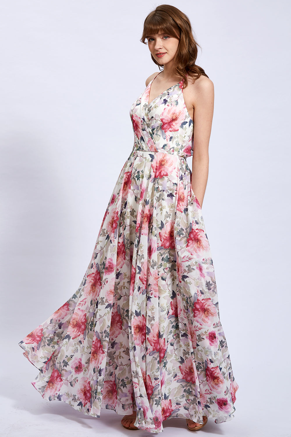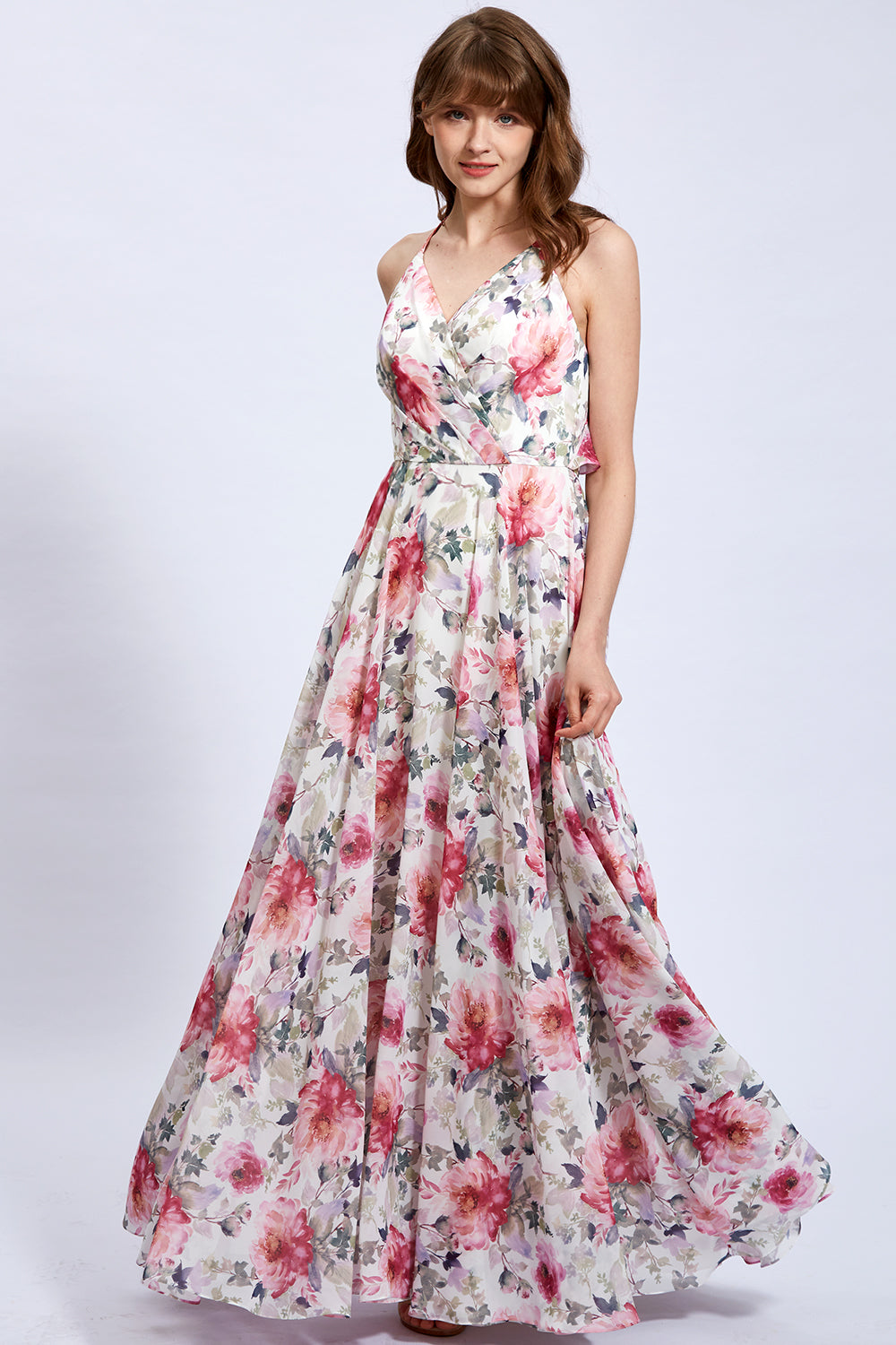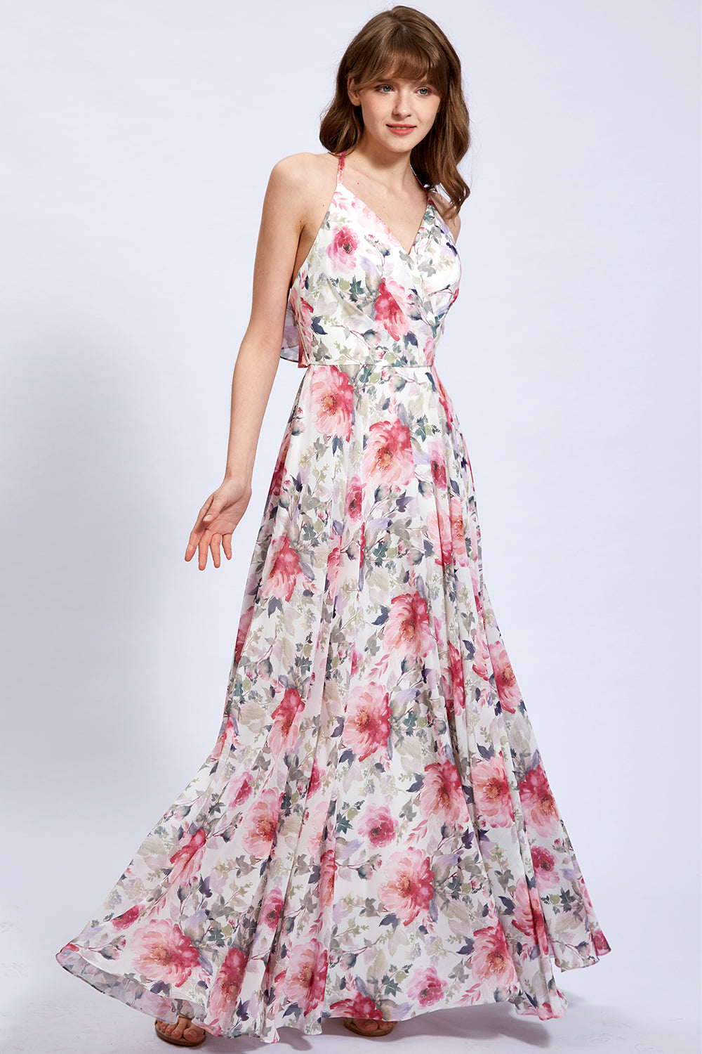 V Neck Sleeveless Pink Floral Formal Bridesmaid Dresses