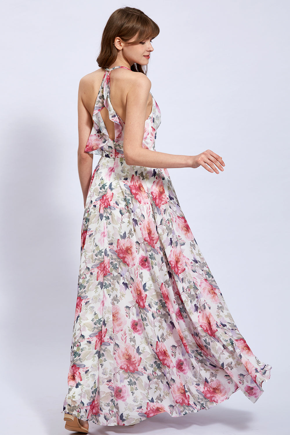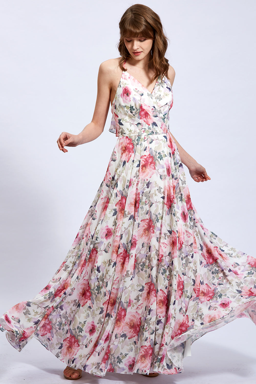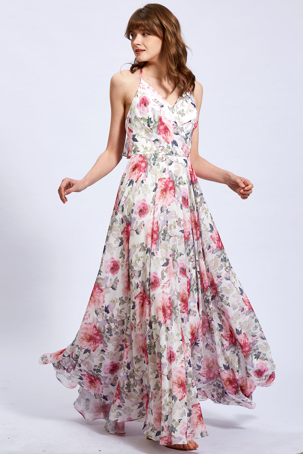 V Neck Sleeveless Pink Floral Formal Bridesmaid Dresses